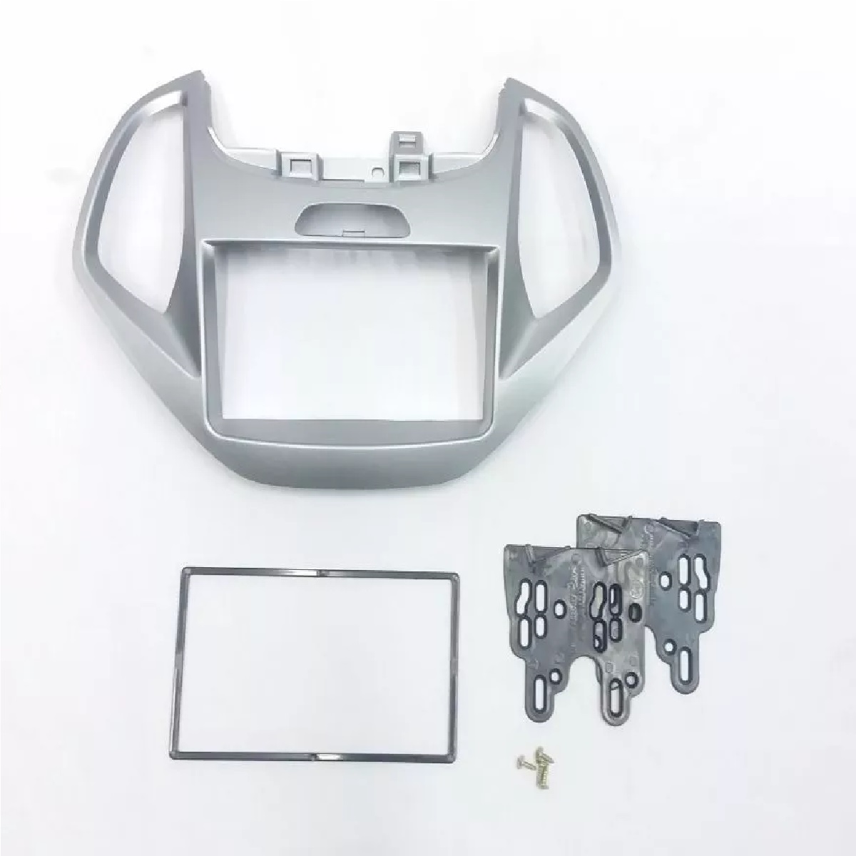Contra frente 2 din, Cinza, para Novo Ford Ka, Ka +, Plus, Sedan 2015..., acompanha moldura intermediária e suportes laterais de fixação.
